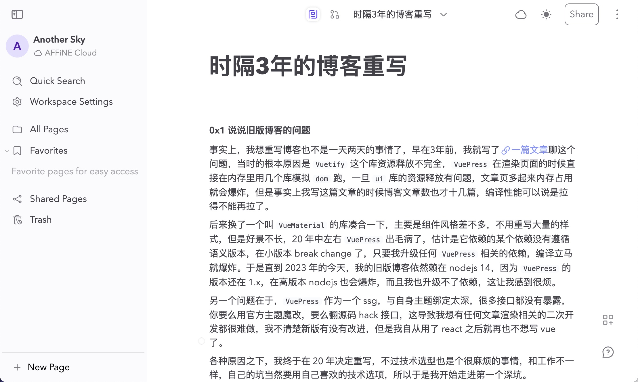 另一个问题在于,VuePress 作为一个 ssg,与自身主题绑定太深,很多接口都没有暴露,你要么用官方主题魔改,要么翻源码 hack 接口,这导致我想有任何文章渲染相关的二次开发都很难做,我不清楚新版有没有改进,但是我自从用了 react 之后就再也不想写 vue 了。