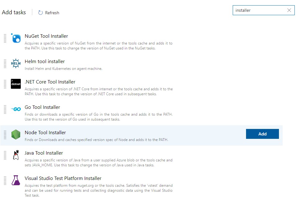 不过,微软也提供了常用的编译环境安装,在 pipeline 里被称为Tool Installer,在 Task 添加页里可以找到