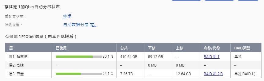 在折腾了几次阵列测试之后,最后选择了这样的阵列结构:首先使用一块 500G SSD 和一块 4T 组成 Qtier 存储池,然后再将两块 4T 组成 RAID1 加入存储池。由于 Qtier 可以让 SSD 层的容量同样用于存储数据,最终的可用空间相比 SSD Cache+4T 3 盘 RAID5 的搭配多 500G 可用空间,并且同样可以用 SSD 加速读写。首先创建两个约 3.5T 的厚卷,目的是让第一个厚卷刚好占满独立的单盘 4T 阵列,第二个厚卷则占满 RAID1 阵列组,并且由于两组阵列处于同一个存储池,因此都可以使用 SSD 进行数据分层。这时候就可以把不太重要和经常使用的数据放在第一个厚卷,例如离线下载和做种的的文件、准备看的电视剧等等,重要的数据和备份放在第二个厚卷,例如手机备份、照片和第一个厚卷的备份等等,这样就可以利用 RAID1 对重要数据容错,同时还可以对所有数据进行读写加速了。当然,虽然有数据容错,备份还是重要的一环,具体的备份策略可以参考3-2-1 backup rule。