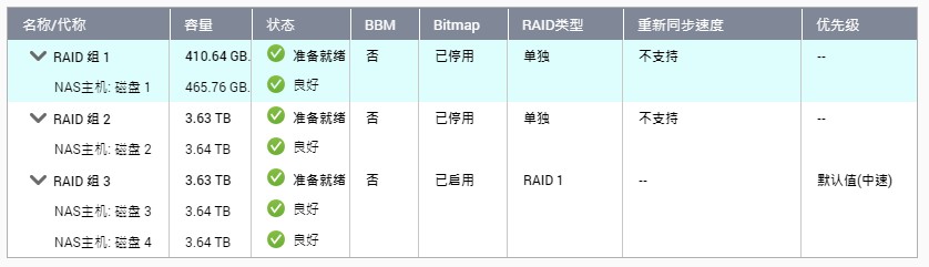 该吹的吹完,下面说说几个月用下来踩的一些坑。第一个是 RAID 的选择,作为一个 4 盘位的机型,相信很少人会选择直接单盘使用,怎么也得搞一下 RAID 和存储池的。在这里奉劝各位不要选择 RAID5 和 RAID6,首先如果你想要给存储池扩容,只能一次性升级池子里的所有硬盘,完全没有灵活性,有些人可能在意的是 RAID5/6 提供 1/2 块硬盘的容错,但是各位需要注意的是 RAID 的原始目标是保持在线,只要不是在极其恶劣的环境下,HDD 是不会一下子就暴毙的,普通用户完全可以暂停读写并把数据转移出来,换上好硬盘后再倒回去,但如果组一个 RAID5/6 阵列,挂了一块盘后 rebuild 阵列,4Tx4 少说也要个三四天,还有在 rebuild 过程中再挂一块盘的风险,Synology 和 Qnap 的 raid 都是基于 mdadm 创建软 raid 阵列,与硬件 raid 卡不同的是,重建过程中如果出现数据错误,不会像阵列卡一样直接把硬盘踢出阵列,而是重试失败后跳到下一个数据块继续重建,这大大降低了重建失败的风险,但是软阵列因为依赖 cpu 性能,重建速度相比硬阵列慢很多,使得 NAS 可能在一段时间内都不可用。